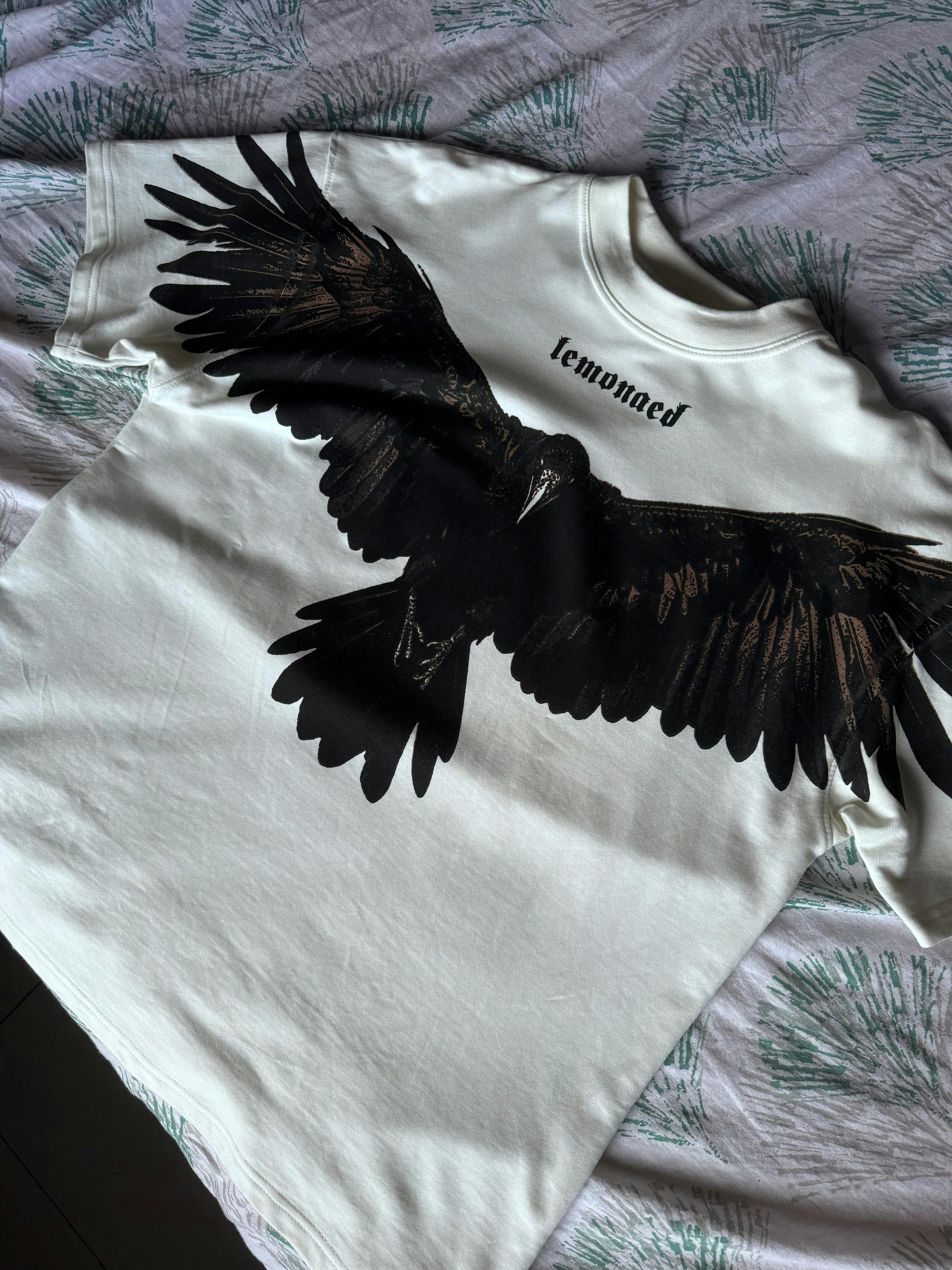 Our design inspiration comes from the raven, symbolizing mystery and transformation. The 40-inch print stretching from sleeve to sleeve, captures the bird’s sharp gaze and details of the feathers. Through sketches and digital refinement, we’ve created a piece that commands attention and evokes intrigue.